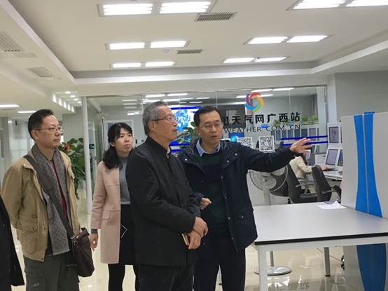在自治区气象服务中心主任粟华林,副主任孔毅民、郑凤琴等领导陪同下,公司三位老师先后来到了自治区气象服务中心的全媒体演播中心,网络信息发布平台以及广西突发事件预警信息发布中心参观,了解公共和行业气象服务、气象影视制播、突发事件预警信息发布等方面工作。