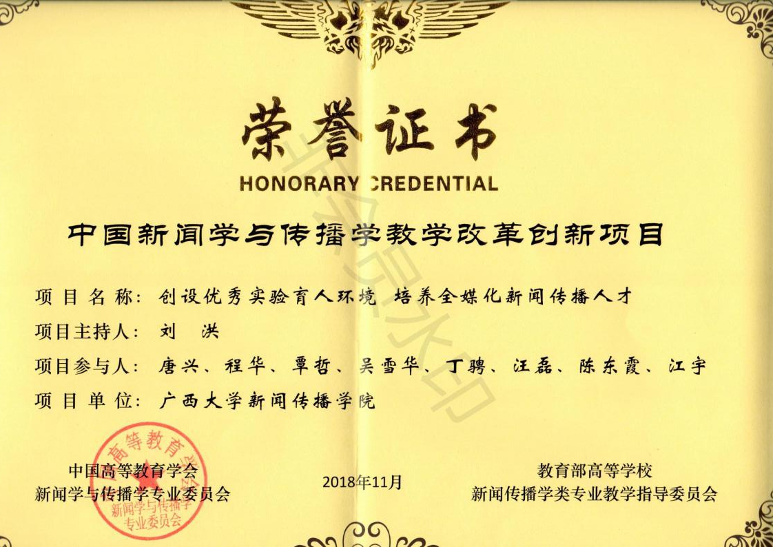 在中国高等教育学会新闻学与传播学专业委员会第八届理事会第一次会议上,由公司报送的创新项目“创设优秀实验育人环境,培养全媒化新闻传播人才”荣获2018年度“中国新闻学与传播学教学改革创新项目”奖,成为本次十一个获奖项目之一。这是继2010年以“beat365体育官方网站‘联合办学’人才模式的研究与实践”和2016年以“开放式读书教学活动”获得此殊荣后,第三次获得该奖项。
