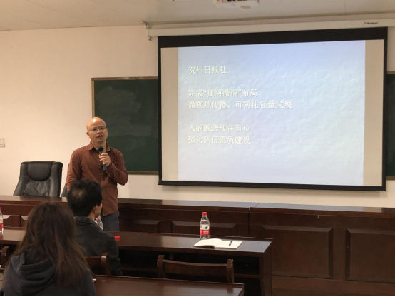 在讲座上,针对全媒体、融媒体话题,刘海钧社长通过对人民日报社全媒体平台的介绍,为公司员工讲解了全媒体时代的特征,并介绍贺州日报社的“全媒体时代”发展成果,同时激励员工要“认真学好本科的课程”,全方位提升自身新闻素养,成为“全媒体记者”。在与毕业生的交流会上,刘海钧社长等人与公司毕业生进行面对面的交谈,使得同学们对报社要求有了进一步了解,同时也使得报社进一步了解了同学们的能力与求职意向。