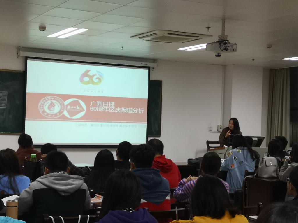 此次“读报、评报”分享会以班级为单位召开,各班在分享交流中,对新闻报道的内容、形式及发展趋势等问题进行了深入探讨,同学们结合自身专业,聚焦整个新闻行业所面临的困境。18专硕班就广西日报60周年区庆系列报道做了专题分析,深入讨论党报报道在区庆宣传工作中发挥的积极作用。新闻161班就虚假新闻泛滥问题,引出了要提高新闻从业者素质的看法。他们认为,一切新闻报道都必须如实报道事实真相,客观反映事物本来面目,新闻工作者要用眼睛观察社会,用头脑思考现实,用手中的笔和镜头记录整个社会的进程。新闻181班就新闻职业认同感降低的问题进行了探讨,并一致认为只有始终坚守以爱国主义为核心的民族精神和以改革创新为核心的时代精神,才能更好的坚守新闻岗位。