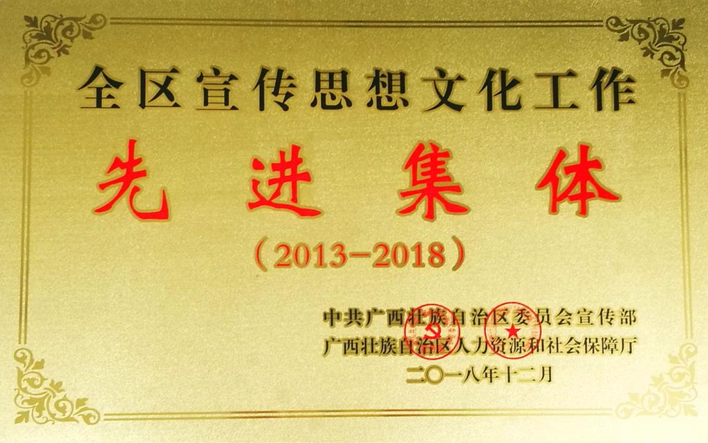 近日,从中共广西壮族自治区委员会宣传部、广西壮族自治区人力资源和社会保障厅发布的关于表彰全区宣传思想文化工作先进集体和先进个人的决定中获悉,公司获全区宣传思想文化工作先进集体荣誉。