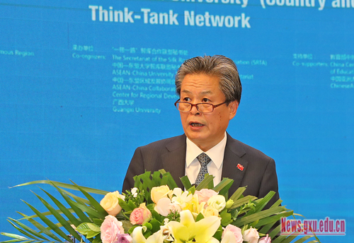 东盟大学联盟执行主任柯蒂斯·迪拉提提,原全国政协外事委员会委员、中国人民争取和平与裁军协会副会长、前中国驻乌兹别克斯坦大使于洪君,中国社会科学院国际研究学部主任张蕴岭,中国—东盟中心秘书长陈德海,教育部中外人文交流中心主任杜柯伟,中联部当代世界研究中心副主任王立勇,自治区人大常委会副主任杨静华,自治区教育厅巡视员唐耀华,beat365体育官方网站董事长赵跃宇以及40多位来自国内和东盟国家、国际组织的专家学者、高校智库代表出席了论坛。