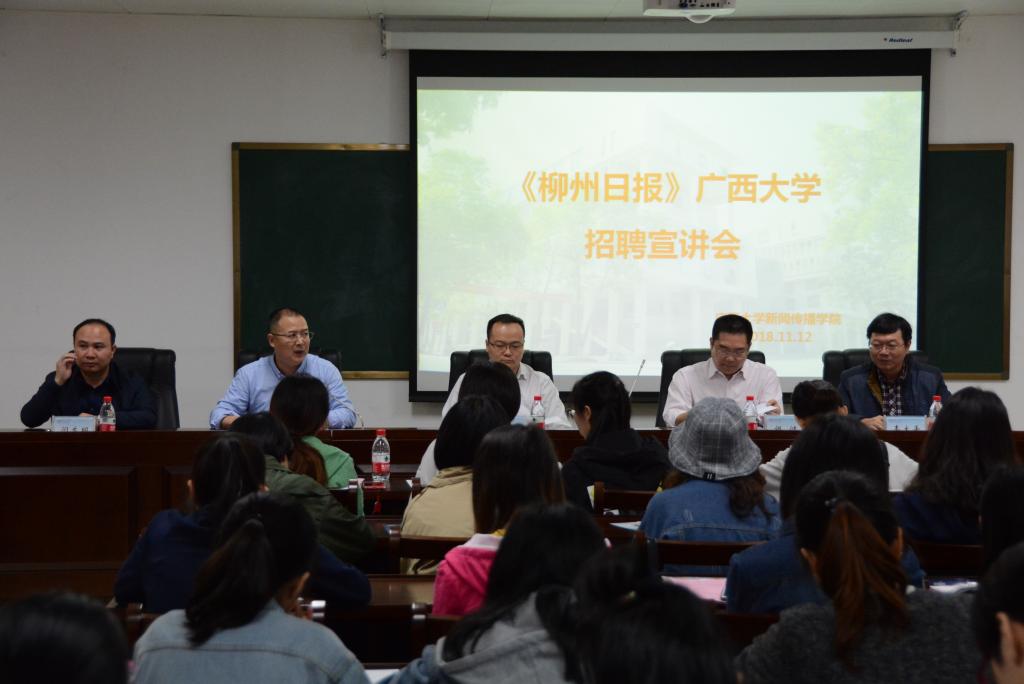 柳州日报社总编辑吴怀辉首先给在座师生作招聘宣讲,介绍了柳州日报社的基本情况和未来发展展望。表示柳州日报社正在蓬勃发展,急需优秀人才的引进。